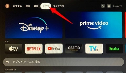 Chromecast with Google TVの初期設定が完了したら、画面上メニューから「アプリ」を選択。