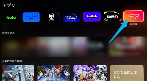 アプリをインストールできたら、Chromecast with Google TVの「おすすめ」に戻り、アプリから『Lemino』を選択。