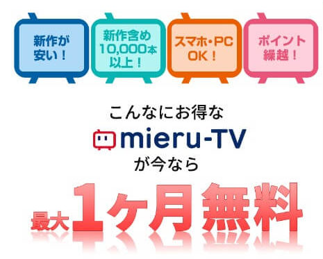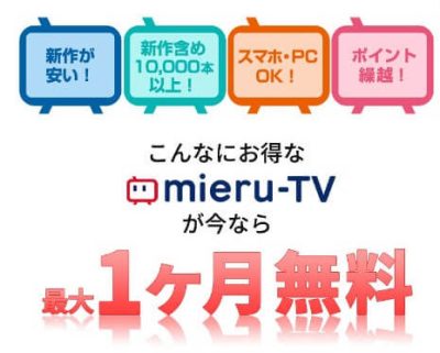 mieru-TVは月額990円で4,000円分のポイント(2ヶ月分)もらえるので、新作映画なら8本見れることになります!