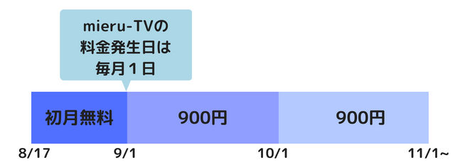 それ以降も10/1、11/1の毎月1日が料金発生日になるので、mieru-TVに登録するなら「月の初め」で、解約するなら「月末」がオススメです!