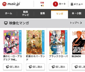 - music.jpにアクセスして、サイト上部から「マンガ」をクリック