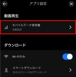 また、スマホ・タブレットのNetflixアプリを利用している場合は、「プロフィール」→「アプリ設定」→「モバイルデータ使用量」も確認してください。