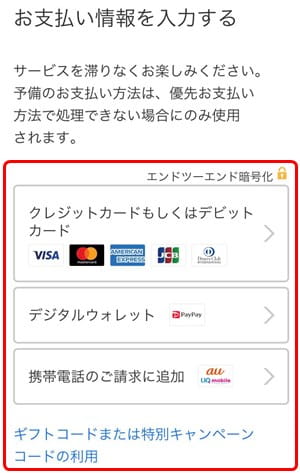 お支払い情報を入力が表示されるので、支払い方法ごとのカード情報や携帯電話番号などを入力。