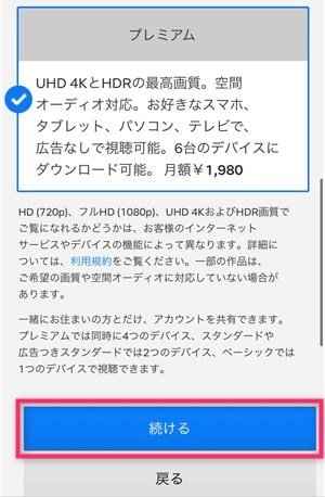 視聴プランを選んでたら、一番下の「続ける」をクリック。