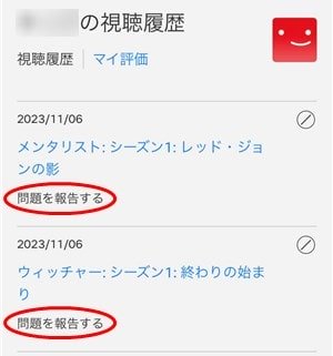 視聴履歴が表示されるので、該当作品の「問題を報告する」をクリック。