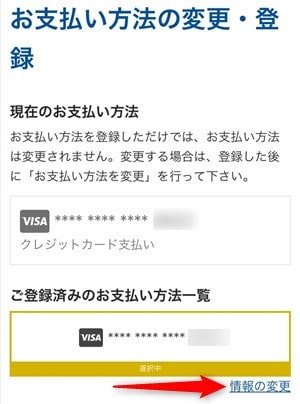 お支払い情報の登録・変更からご登録済みのクレジットカードの「情報の変更」をクリック。