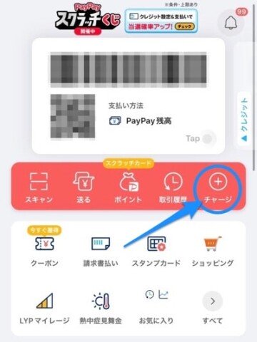 PayPay残高をチャージするには、PayPayアプリのホーム画面から「チャージ」をクリック。