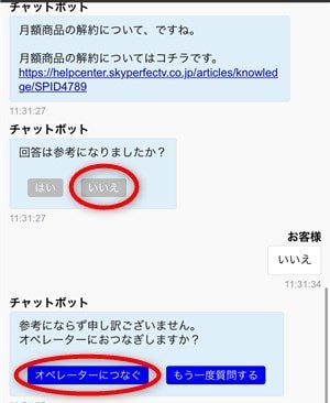 適当に「解約」と入力していくつかの質問を回答していき、最後の「回答は参考になりましたか?」に『いいえ』と回答します。