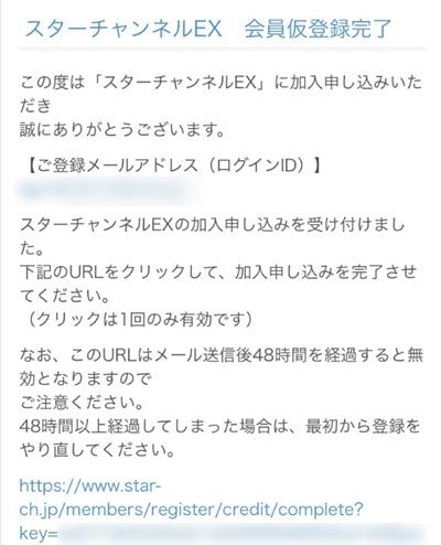 スターチャンネルEXの会員仮登録完了メールが届かないと、最後のURLをクリックできないので登録できません。