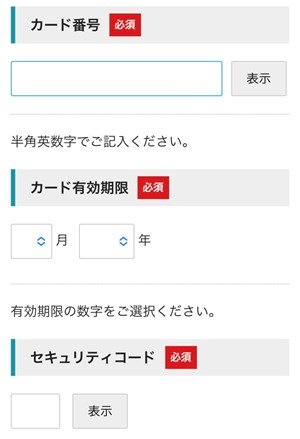 クレジットカードの「カード番号」「カード有効期限」「セキュリティコード」を入力・選択。