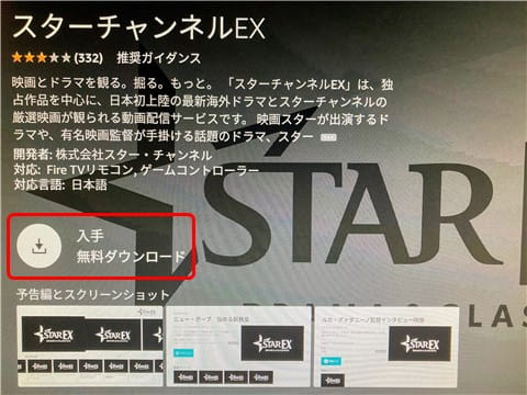 Fire TV Stickの初期設定が終わったら、アプリストアや検索からスターチャンネルEXを探して「入手/ダウンロード」を押します。