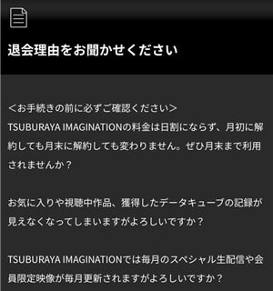 円谷イマジネーションの注意事項を確認して、退会理由アンケートに答えます(※任意回答)。