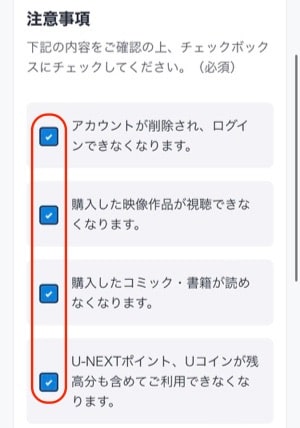 U-NEXTアカウントの削除になるので、注意事項を確認して「チェックマーク」を入れます。