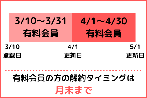 例えば3月10日に登録したら、契約期間は3月10日〜3月31日なので、解約タイミングは「3月31日まで」となります。