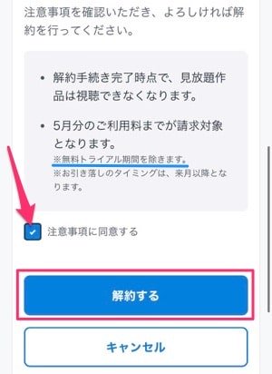 最後に「注意事項に同意する」にチェックを入れて、『解約する』を押してください(こちらを押したら戻れません)。