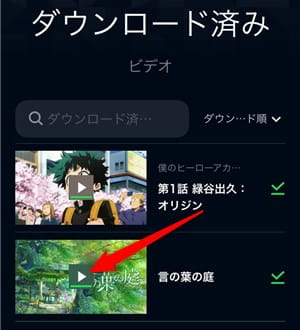ダウンロード済みの動画が表示されるので、見たい作品の「再生アイコン」をクリック。