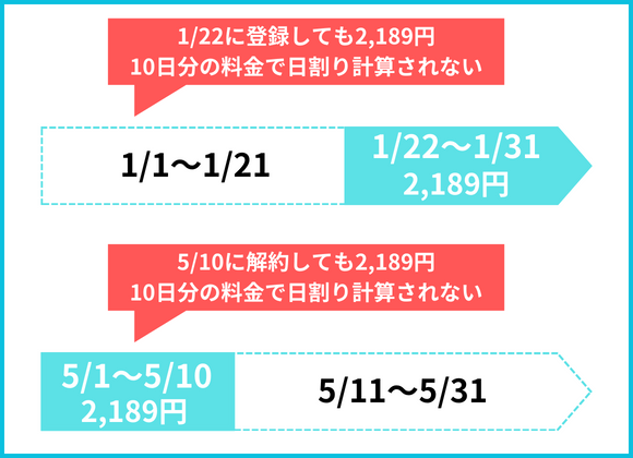 この事を知らずに月末に登録してしまうと、数日しか利用していないのに1ヶ月分の料金を請求されるので注意が必要です。