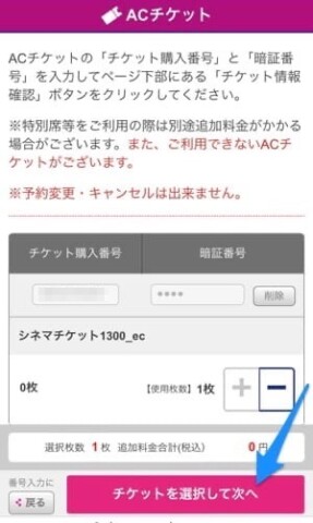 シネマチケットの使用枚数分だけ「プラスアイコン」を押します(今回は1枚なので1回押します)。