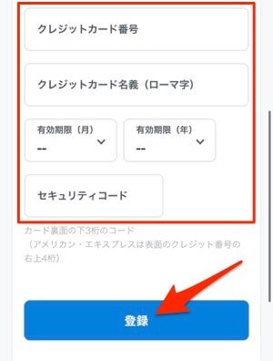 支払い情報の登録・変更で新しいクレジットカード番号、クレジットカード名義、有効期限、セキュリティコードを入力して「登録」をクリック。