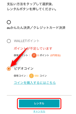 最後に支払い方法から「ビデオコイン」を選んで、一番下の『レンタル』をクリック。