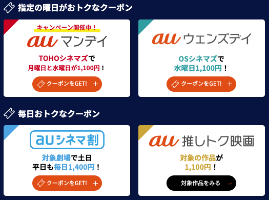 | au推しトク映画 | 最大900円割引 (1,100円) |